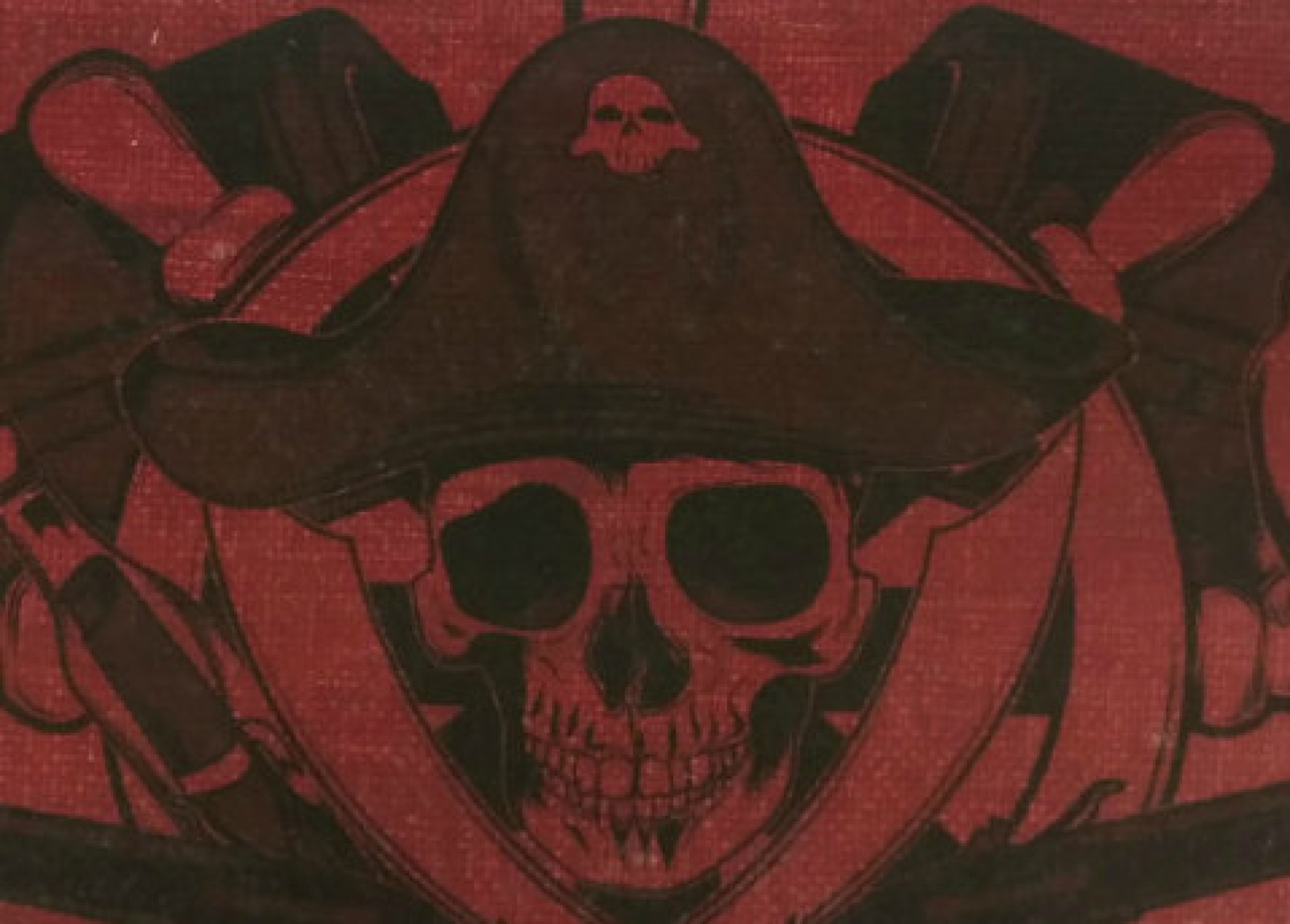 This macabre pirate skull would be a unique addition to your pirate themed party decorations. This piece on a canvas panel measures 5X7 inches and features a pirate skull, crossed rifles, and pirate treasure. The canvas was painted to mimic the creepy color of dried blood and the image was created using gel medium transfer of ink from paper to canvas. Due to the unpredictability of gel transfers, the image has imperfections and an overall distressed look, adding character to the piece. It was made with care and will add a bit of wow to your wall. This piece is unframed.